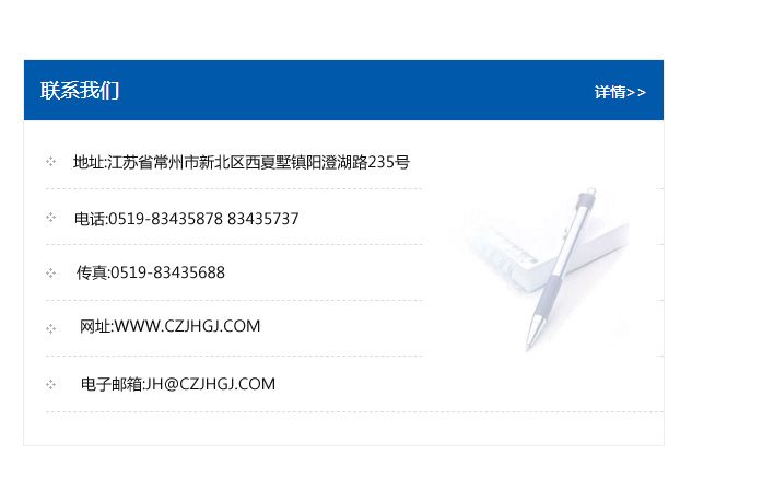 地址:常州市新北區友邦商務大廈1幢16、17層  電話:0519-85101652  傳真:0519-85112595  郵編:213022  網址:www_cz-jiayue_cn.cqhrhb.com  郵箱:xiajifengaa@163.com